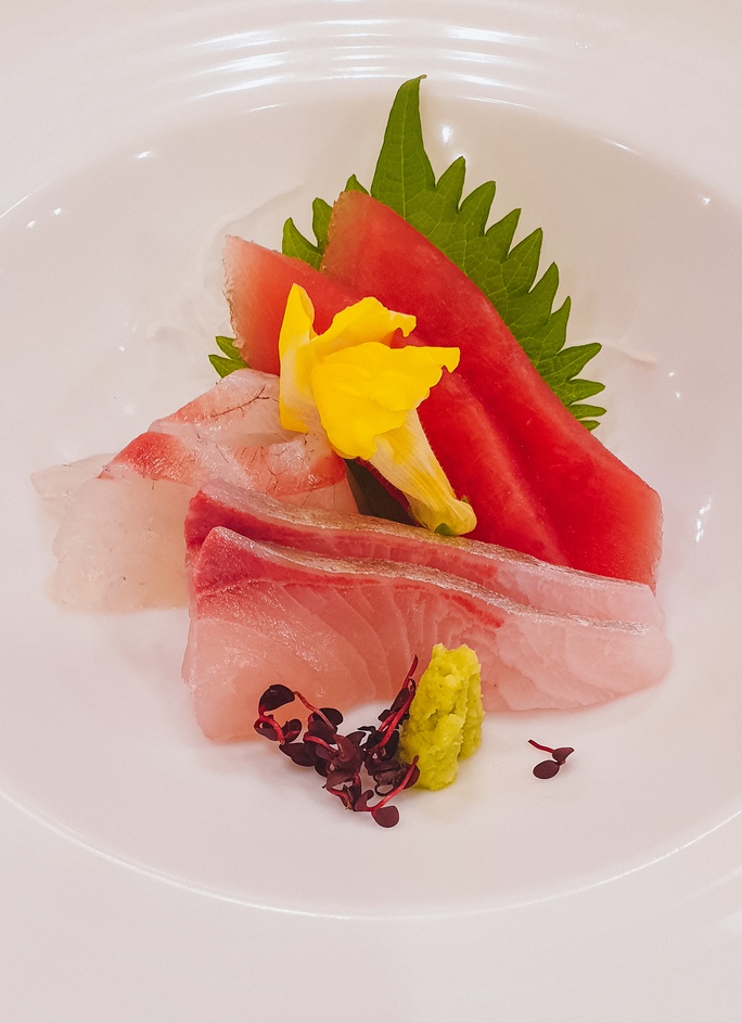 Sashimi cá ngừ sở hữu hương vị thơm ngon đặc trưng. Những lát cá ngừ tươi chấm cùng wasabi và nước tương thơm phức thực sự sẽ đánh thức mọi giác quan. Trong khi đó, sashimi cá cam mang đến những miếng thịt cá trắng ửng chút hồng lạ mắt. Cảm giác đầu tiên khi ăn sashimi là vị cay nồng xộc đến mũi, sau đó là vị mặn của nước tương và ngọt, tươi của cá sống.
